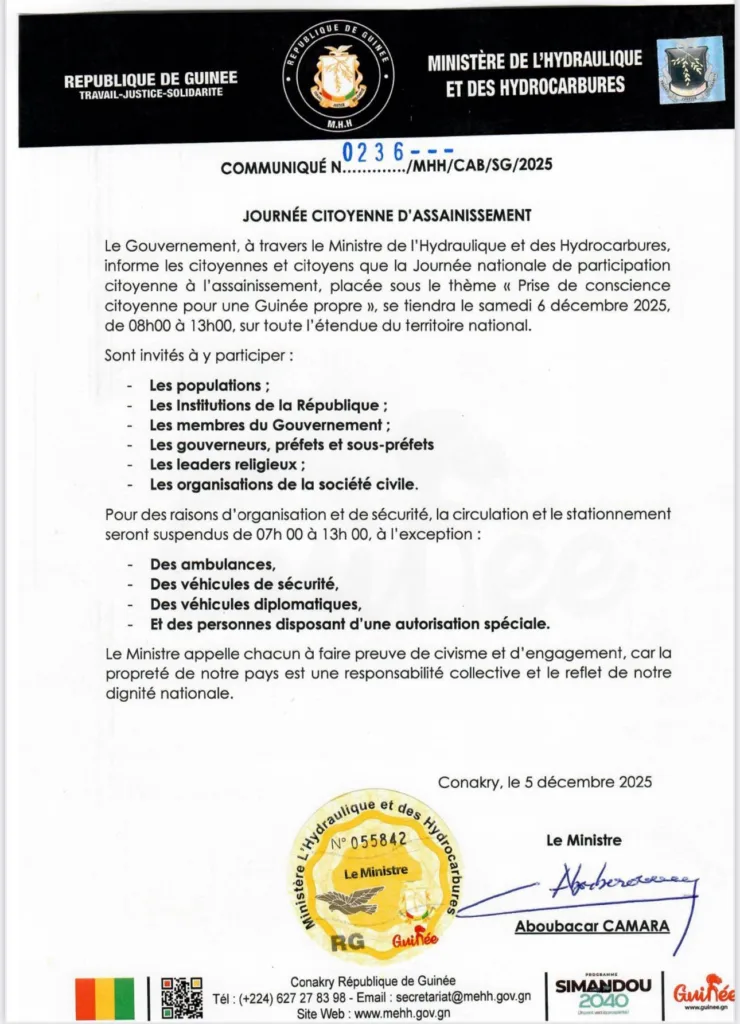 Le Ministère de l’Hydraulique et des Hydrocarbures informe l’ensemble de la population guinéenne de la tenue de la Journée nationale de participation citoyenne à l’assainissement, prévue ce samedi 6 décembre 2025, de 08h00 à 13h00, sur toute l’étendue du territoire national.