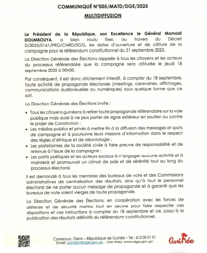 Dans un communiqué dont rtgguinée.info détient copie, la Direction Générale des Élections (DGE) rappelle que la campagne électorale en vue du référendum prévu pour le 21 septembre 2025, prendra fin ce jeudi 18 septembre à minuit.