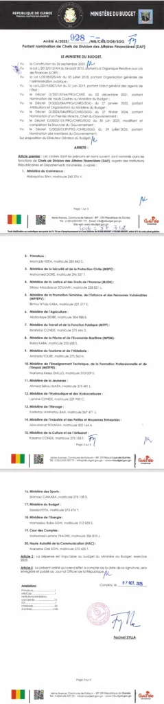 Le ministre du Budget Facinet Sylla, a procédé, le mercredi 08 octobre 2025, à la nomination de plusieurs chefs de divisions des affaires financières au sein des départements ministériels du pays.