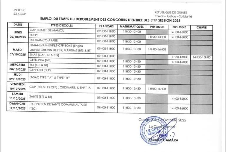 Dans un communiqué publié vendredi dernier, le ministère de l’Enseignement Technique, de la Formation Professionnelle et de l’Emploi informe l’ensemble des candidats que le concours d’accès aux Écoles Techniques et Professionnelles se déroulera du 06 au 12 octobre 2025, sur toute l’étendue du territoire national.