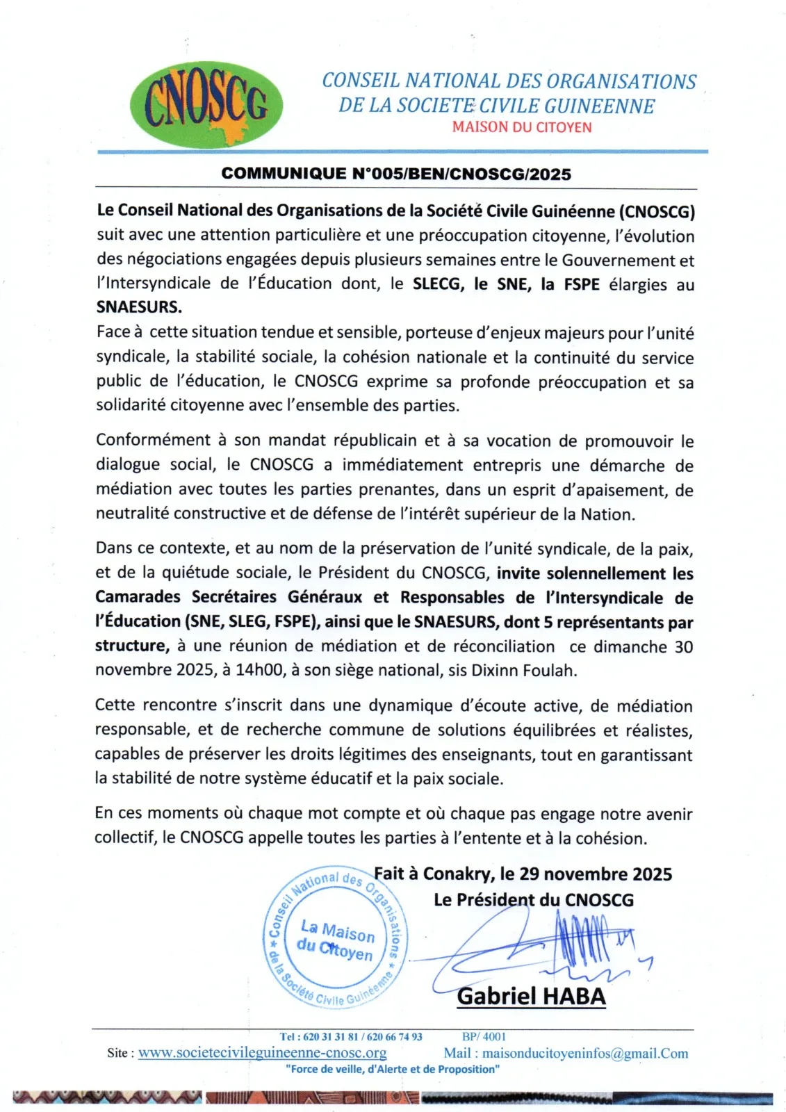Face au déclenchement d’une grève générale illimitée par les syndicats de l’éducation, le Conseil national des organisations de la société civile guinéenne (CNOSC-G) annonce la tenue d’une réunion cruciale ce dimanche 30 novembre 2025. Cette initiative vise à favoriser le dialogue et à préserver l’intérêt supérieur de la Nation dans un contexte social particulièrement tendu.