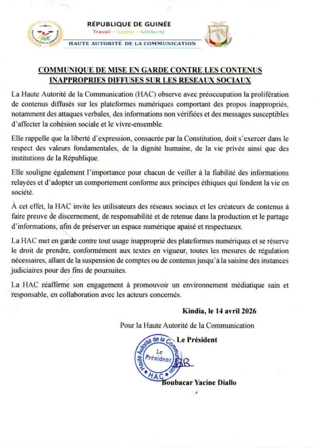 Dans un communiqué rendu public dans la nuit du 14 au 15 avril 2026, la Haute Autorité de la Communication (HAC) a exprimé sa vive préoccupation face à la multiplication de contenus jugés préoccupants sur les plateformes numériques.