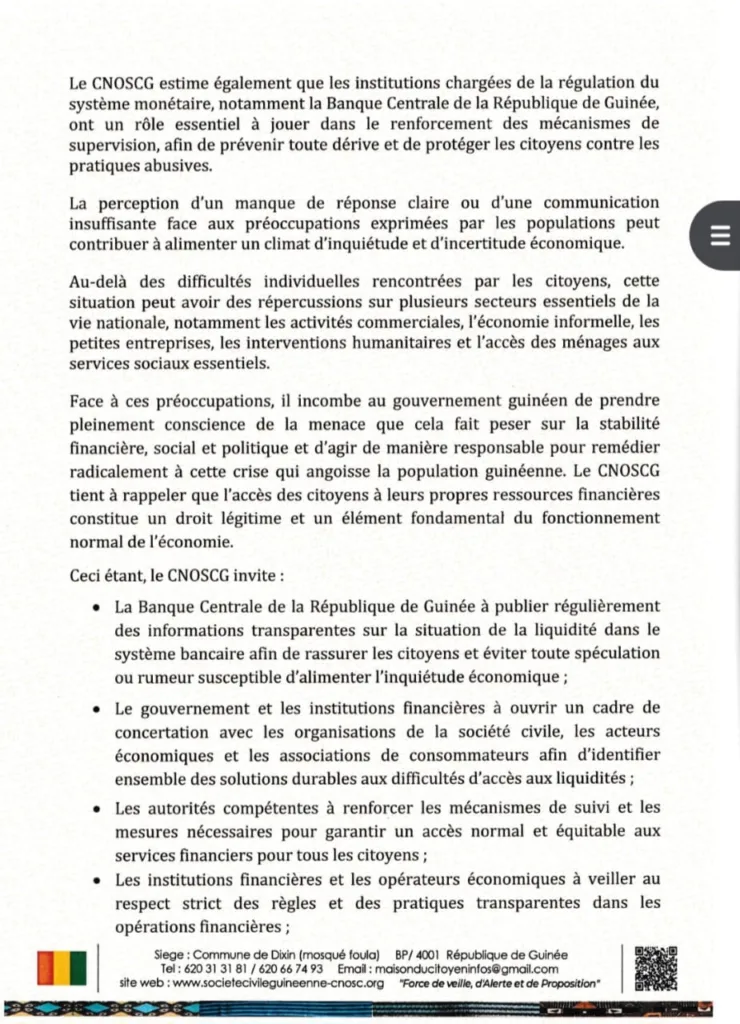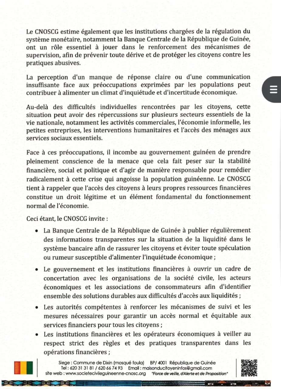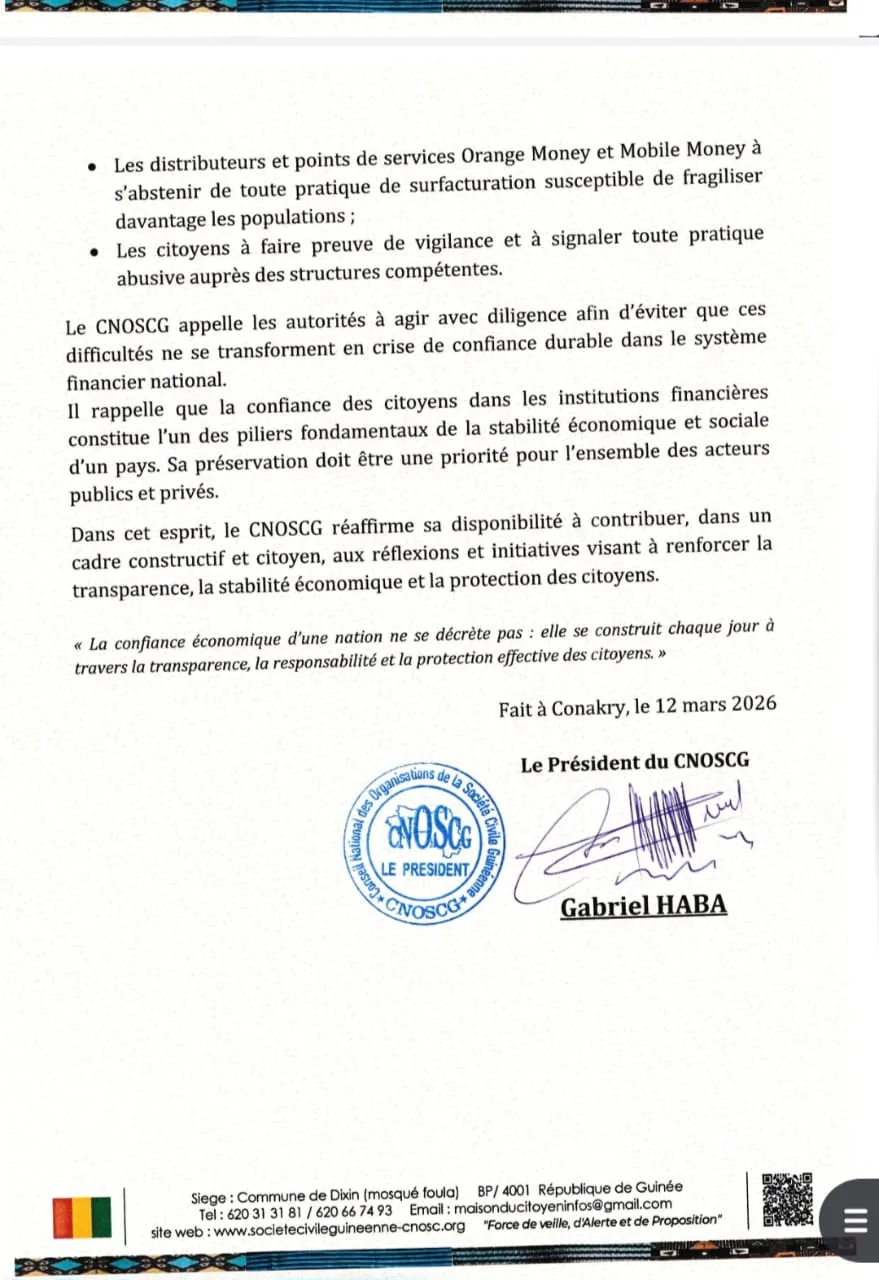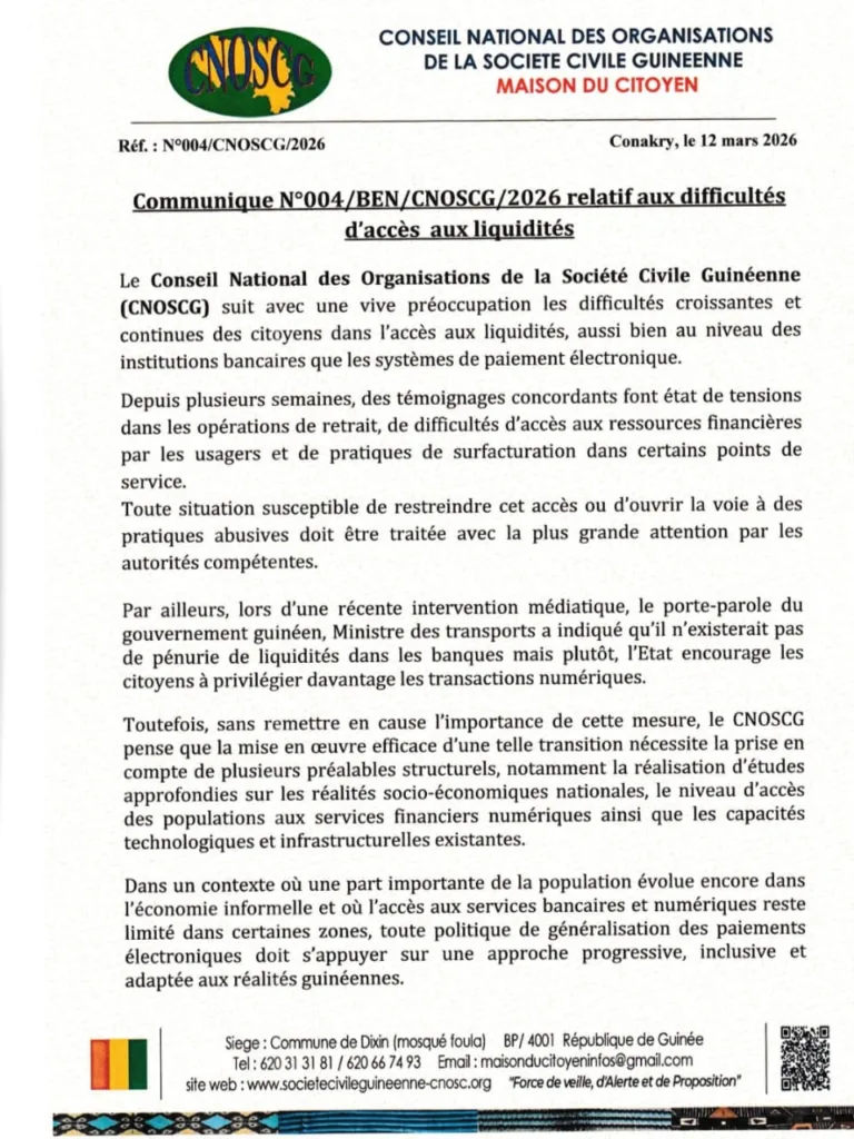 Dans un communiqué dont copie a été transmise à notre rédaction dans l’après-midi de ce jeudi 12 mars 2026, le Conseil National des Organisations de la Société Civile de Guinée (CNOSC-G) a exprimé sa vive préoccupation face aux difficultés d’accès aux liquidités observées dans certaines banques de la place.