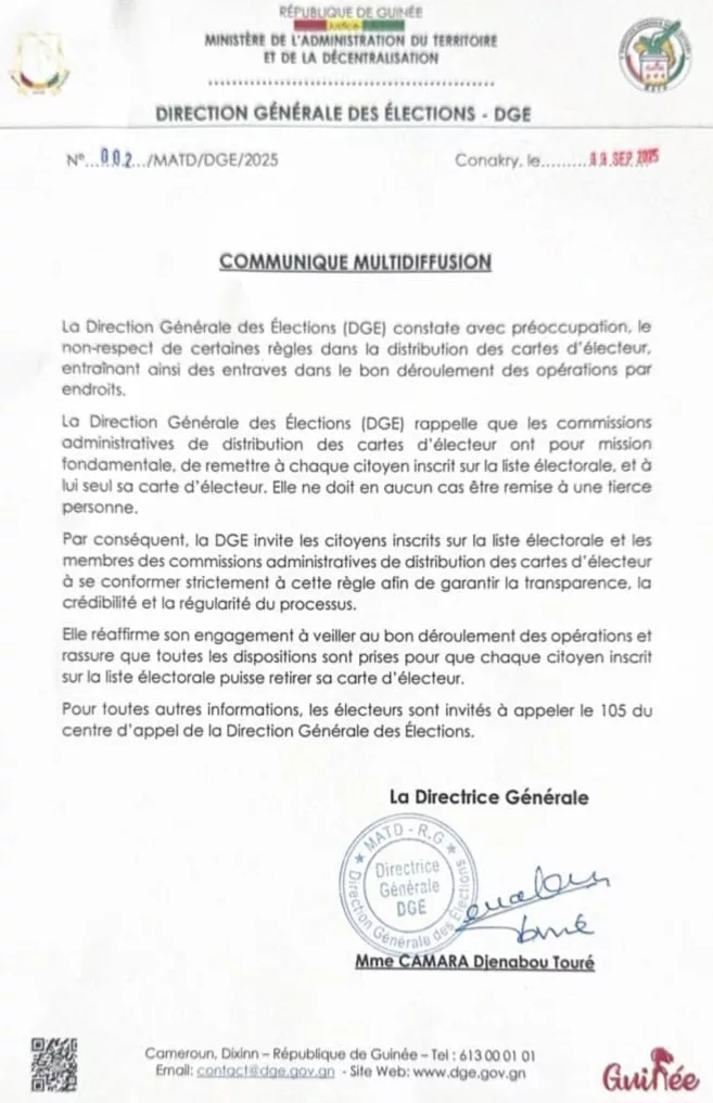 La Direction Générale des Élections (DGE) a, dans un communiqué rendu public ce mercredi 10 septembre 2025, exprimé sa préoccupation face au non-respect de certaines règles dans la distribution des cartes d’électeur.