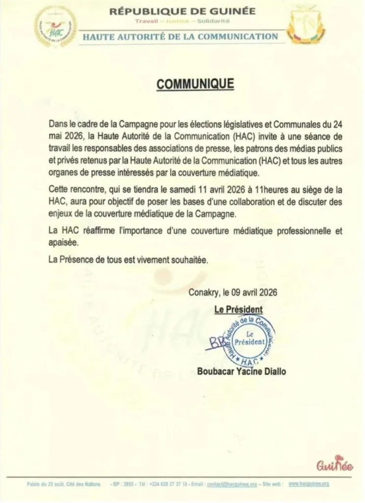 À l’approche des élections législatives et communales prévues le 24 mai 2026, la Haute Autorité de la Communication (HAC) engage le dialogue avec les acteurs des médias. Une rencontre stratégique est prévue le 11 avril à Conakry afin de définir les contours d’une couverture médiatique professionnelle, équilibrée et respectueuse des principes démocratiques.