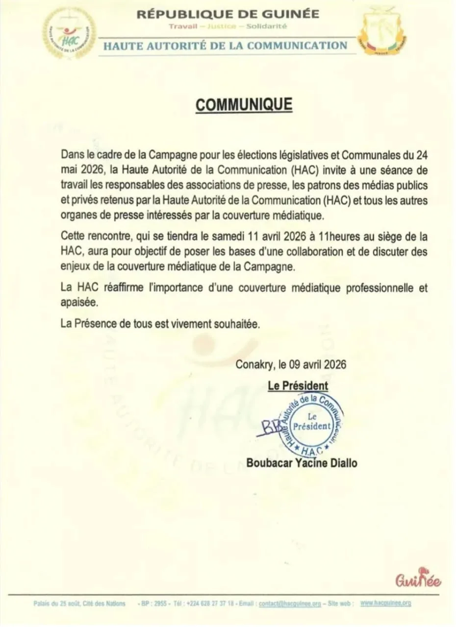 À l’approche des élections législatives et communales prévues le 24 mai 2026, la Haute Autorité de la Communication (HAC) engage le dialogue avec les acteurs des médias. Une rencontre stratégique est prévue le 11 avril à Conakry afin de définir les contours d’une couverture médiatique professionnelle, équilibrée et respectueuse des principes démocratiques.
