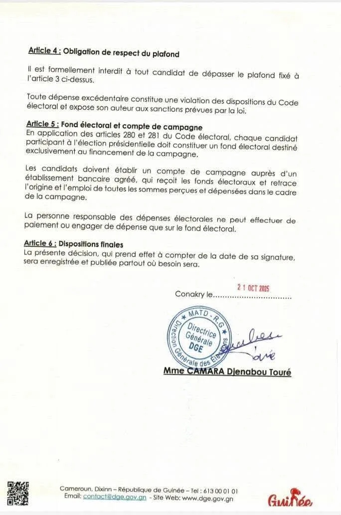Par ailleurs, le montant global des dépenses de campagne électorale est plafonné à quarante milliards (40 000 000 000) de francs guinéens (GNF) par candidat, précise la même source.