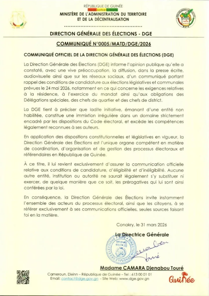 La Direction Générale des Élections (DGE) sort de sa réserve et met en garde contre toute tentative d’ingérence dans le processus électoral. Dans un communiqué officiel rendu public ce 31 mars 2026, l’institution dénonce la diffusion, par une entité non habilitée, d’un document relatif aux conditions de candidature aux prochaines élections législatives et communales prévues le 24 mai 2026.