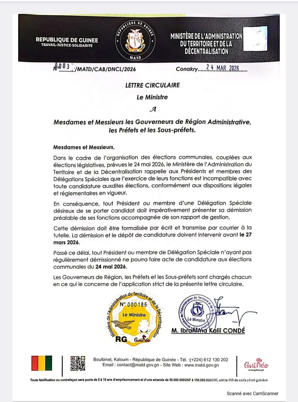 À l’approche des élections communales et législatives prévues le 24 mai 2026, le ministère de l’Administration du Territoire et de la Décentralisation (MATD) durcit le ton pour garantir la transparence et l’équité du processus électoral. Dans une lettre circulaire en date du 24 mars 2026, le ministre Ibrahima Kalil Condé rappelle avec fermeté les règles encadrant la participation des responsables locaux aux prochaines échéances électorales.