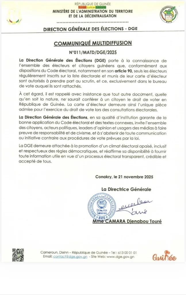 Dans un communiqué rendu public le 21 décembre 2025, la Direction générale des élections (DGE) a rappelé aux citoyens guinéens que la participation au scrutin du 28 décembre est strictement réservée aux électeurs régulièrement inscrits sur la liste électorale. L’institution précise que seuls les détenteurs d’une carte d’électeur valide seront autorisés à accomplir leur devoir civique dans les bureaux de vote. Cette mise au point vise à garantir la transparence et la crédibilité du processus électoral.
