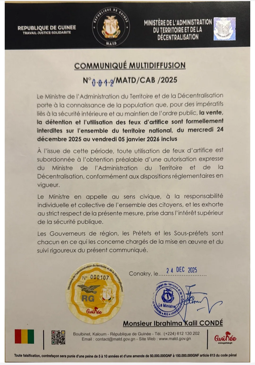 Dans un communiqué parvenu à notre rédaction dans la soirée de ce mercredi 24 décembre 2025, le gouvernement guinéen, à travers le Ministère de l’Administration du Territoire et de la Décentralisation (MATD), a formellement interdit l’utilisation des feux d’artifice du mercredi 24 décembre 2025 au lundi 5 janvier 2026.