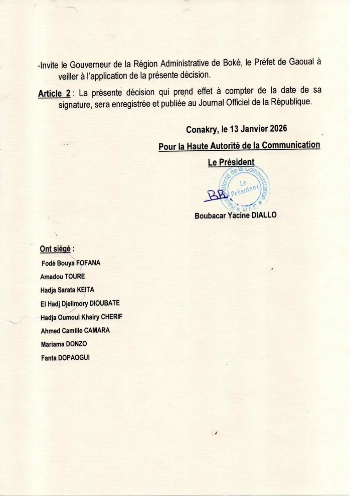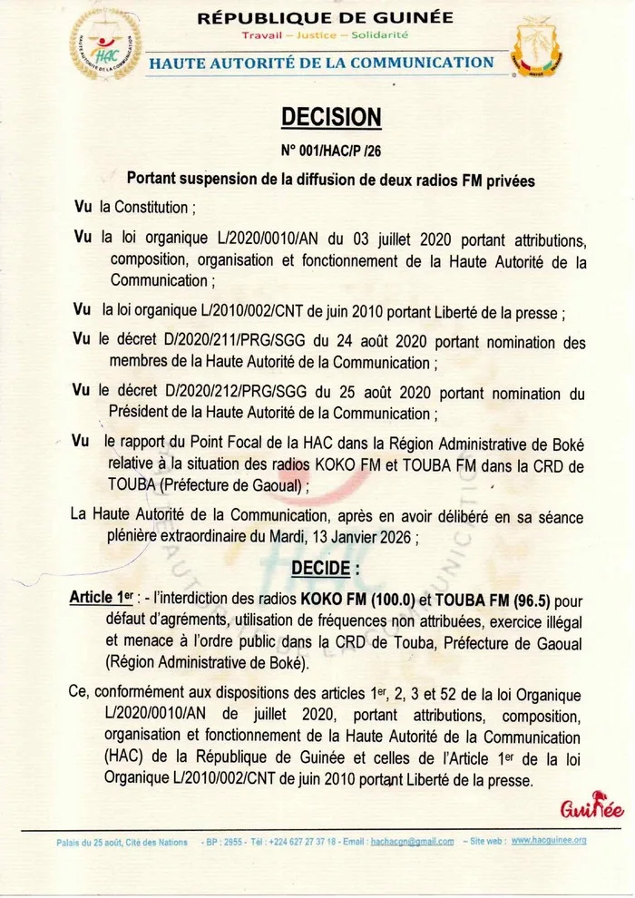 La Haute Autorité de la Communication (HAC) a ordonné la cessation immédiate des émissions des radios KOKO FM (100.0 MHz) et TOUBA FM (96.5 MHz). La décision, prise ce mardi 13 janvier 2026, vise deux stations opérant dans la Communauté rurale de développement (CRD) de Touba, relevant de la préfecture de Gaoual, en région administrative de Boké.