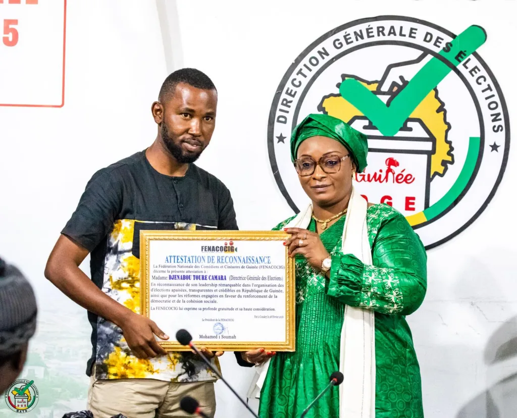 La séance de travail, tenue dans la salle de réunion de la DGE, s’est achevée par un moment symbolique fort : la remise d’une attestation de reconnaissance à Mme Camara Djénabou Touré. Ce geste vise à saluer son leadership ainsi que les réformes engagées sous son autorité pour renforcer la crédibilité, la transparence et l’inclusivité du processus électoral en République de Guinée.