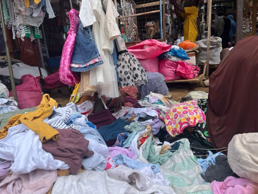 Les commerçantes exposent robes, chaussures et habits pour enfants sur des tables, des bâches ou parfois directement à même le sol. À chaque instant, certaines déplacent précipitamment leurs marchandises pour éviter les contrôles, accentuant l’agitation permanente qui règne dans le marché.