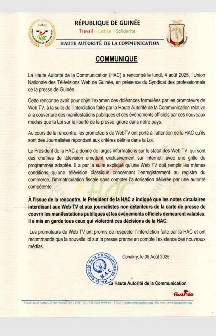 La Haute Autorité de la Communication HAC a eu un entretien le mardi 05 août 2025, avec les représentants de l’Union Nationale des Télévisions Web de Guinée. L’objectif de la rencontre était d’analyser ensemble les doléances formulées par ces promoteurs de Web TV, cette suite de l’interdiction faite par la Haute Autorité de la Communication relative à la couverture des manifestations publiques et des évènements officiels par ces nouveaux médias jusque-là non encore reconnus par la Loi sur la liberté de la presse en Guinée.