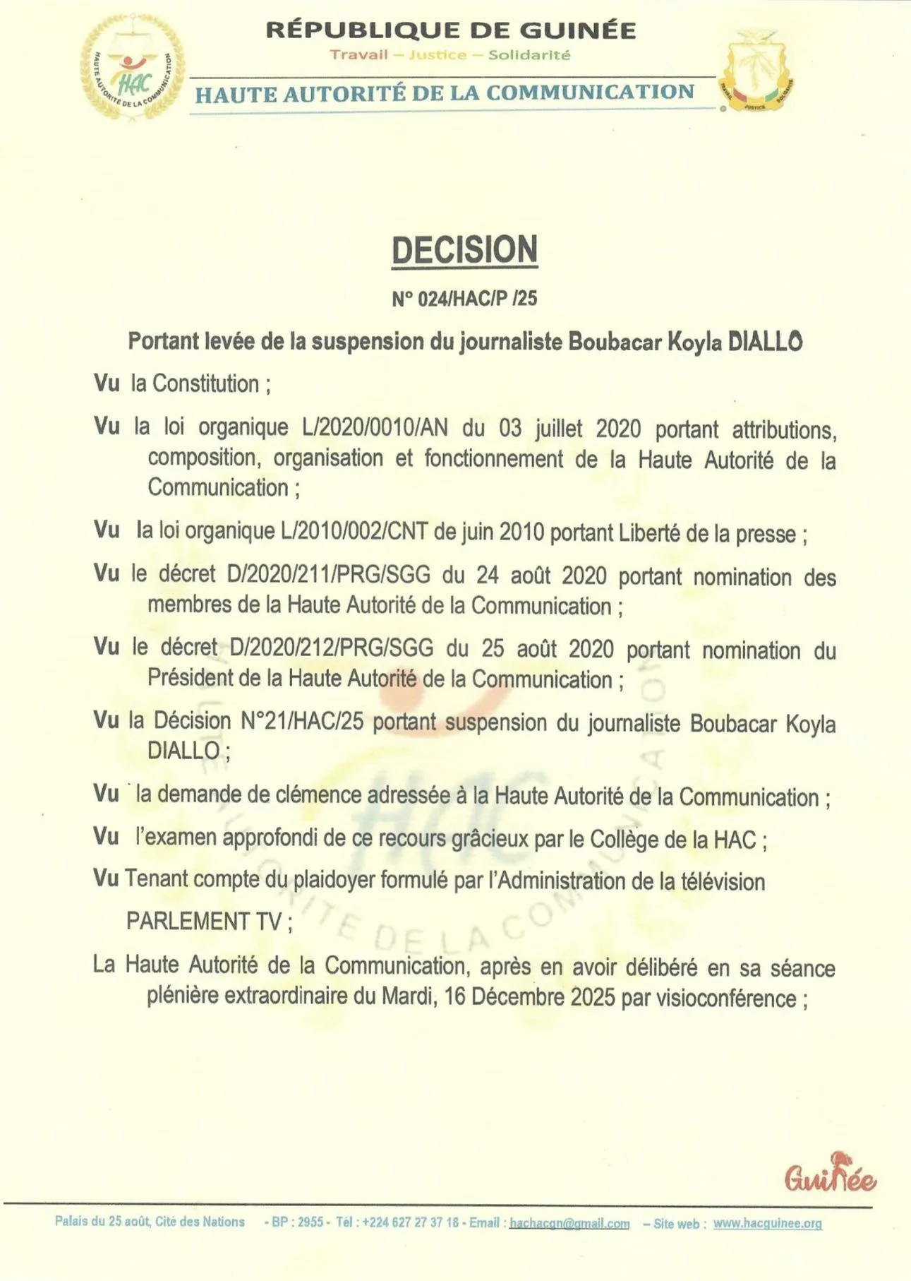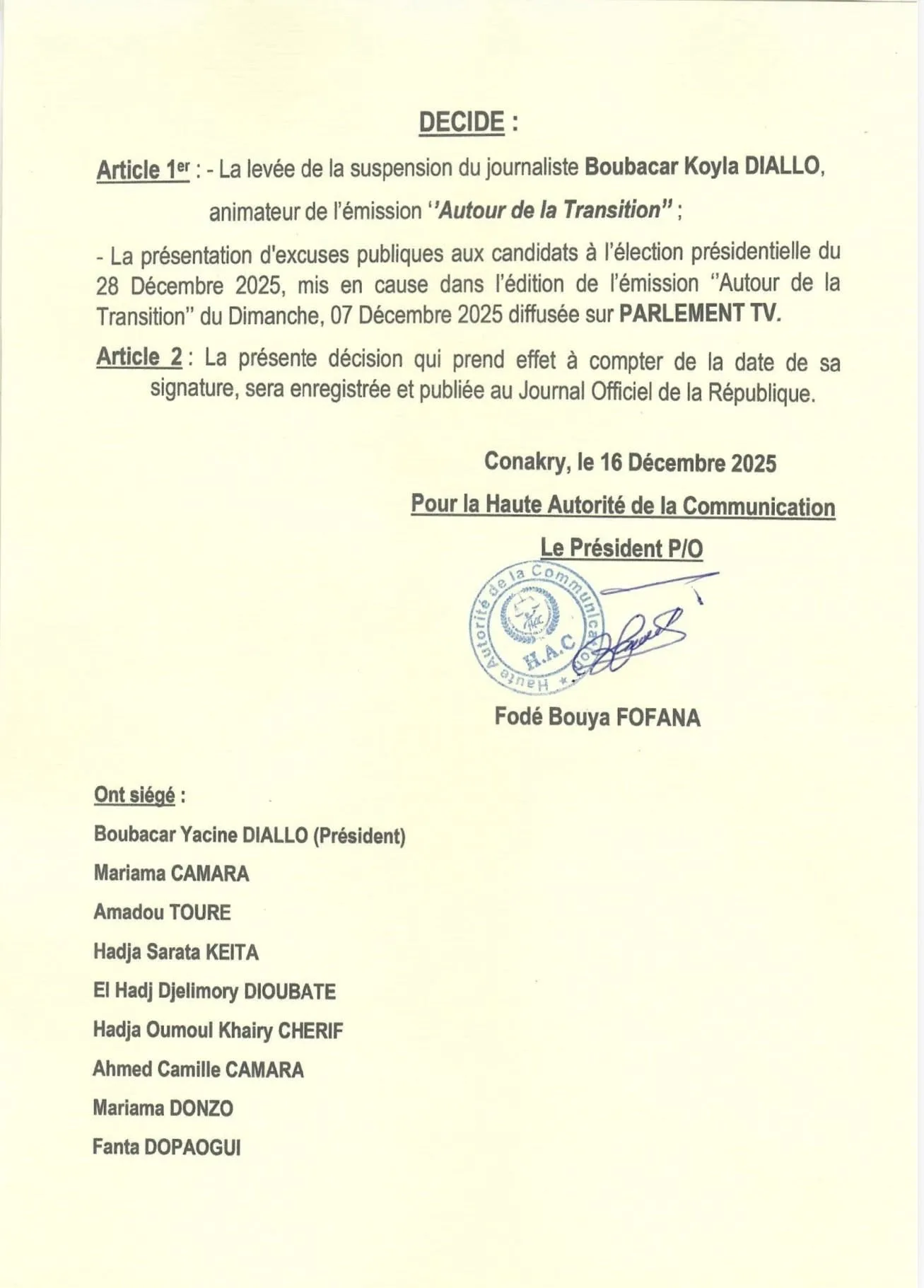 La Haute Autorité de la Communication (HAC), après délibération lors de sa séance plénière extraordinaire tenue par visioconférence le mardi 16 décembre 2025, a décidé de lever la suspension du journaliste Boubacar Koyla Diallo, animateur de l’émission « Autour de la Transition ».