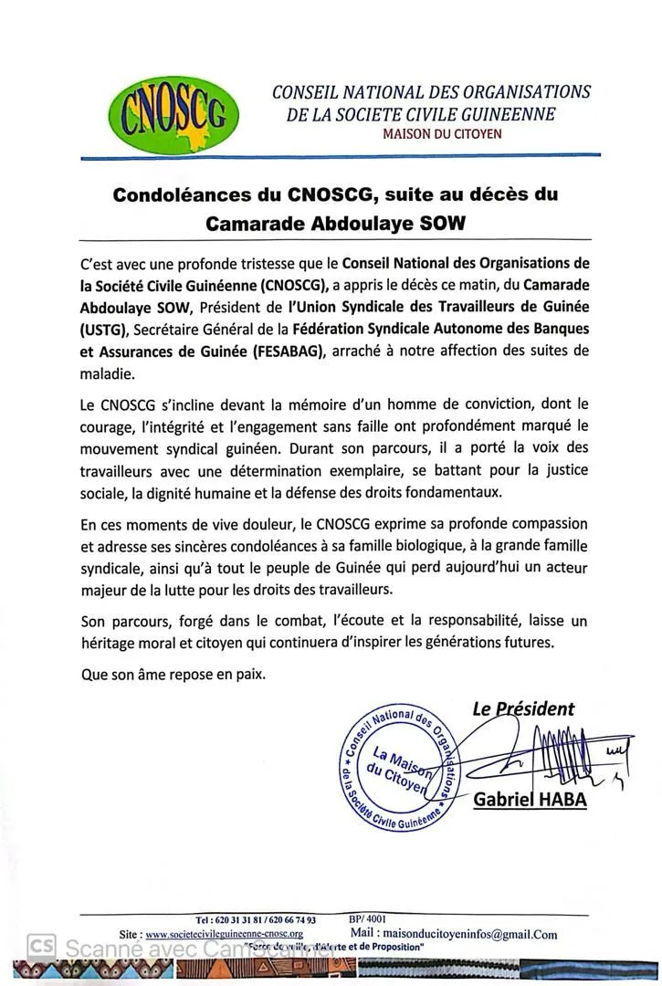 À travers ce message de condoléances, le CNOSC-G rend un hommage appuyé à un homme de conviction, de dialogue et de responsabilité, dont la disparition constitue une grande perte pour le monde syndical et pour la société civile guinéenne.