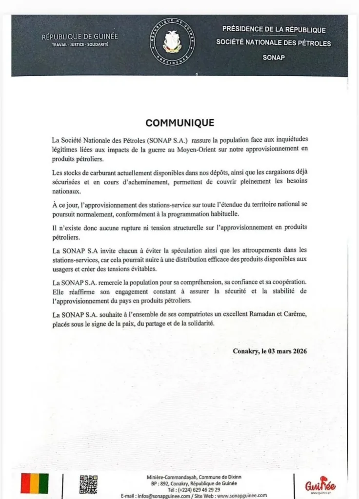 Dans un communiqué officiel, la SONAP assure que les stocks disponibles, ainsi que les cargaisons en cours d’acheminement, sont suffisants pour couvrir l’ensemble des besoins nationaux en produits pétroliers. L’entreprise appelle ainsi les citoyens au calme et les invite à éviter tout mouvement de panique susceptible de perturber l’approvisionnement normal du marché.
