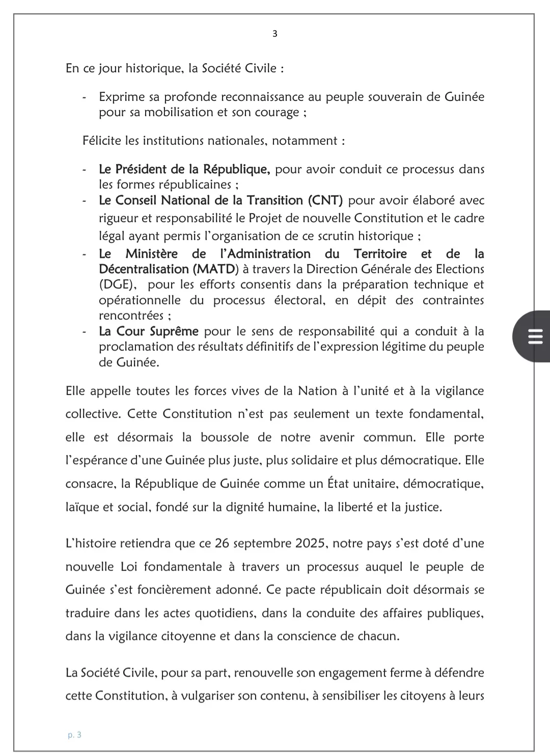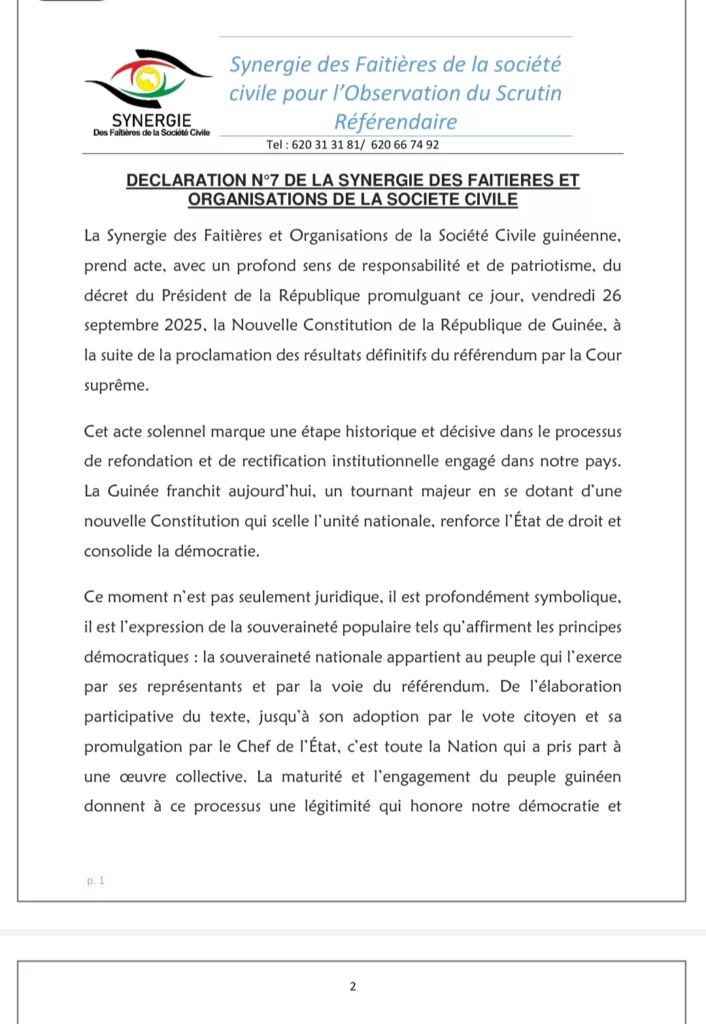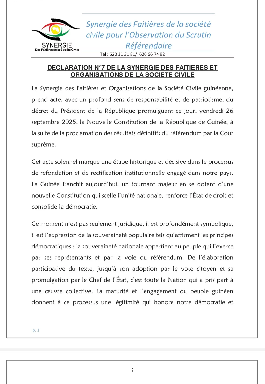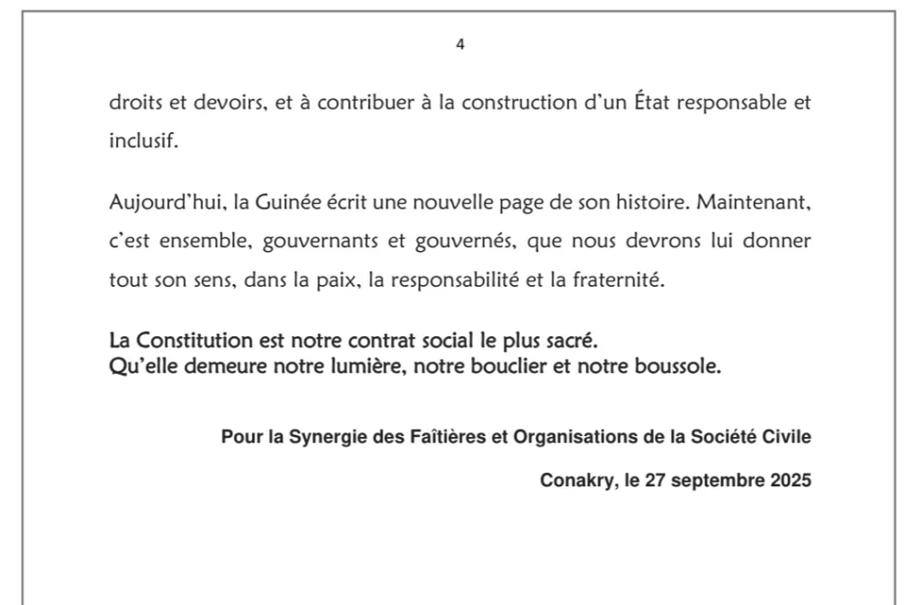 Dans une déclaration rendue publique le samedi 27 septembre 2025, la société civile guinéenne, réunie au sein des faîtières de la société civile et coordonnée par Gabriel Haba, s’est engagée à veiller à l’application loyale et intégrale de la nouvelle Constitution.