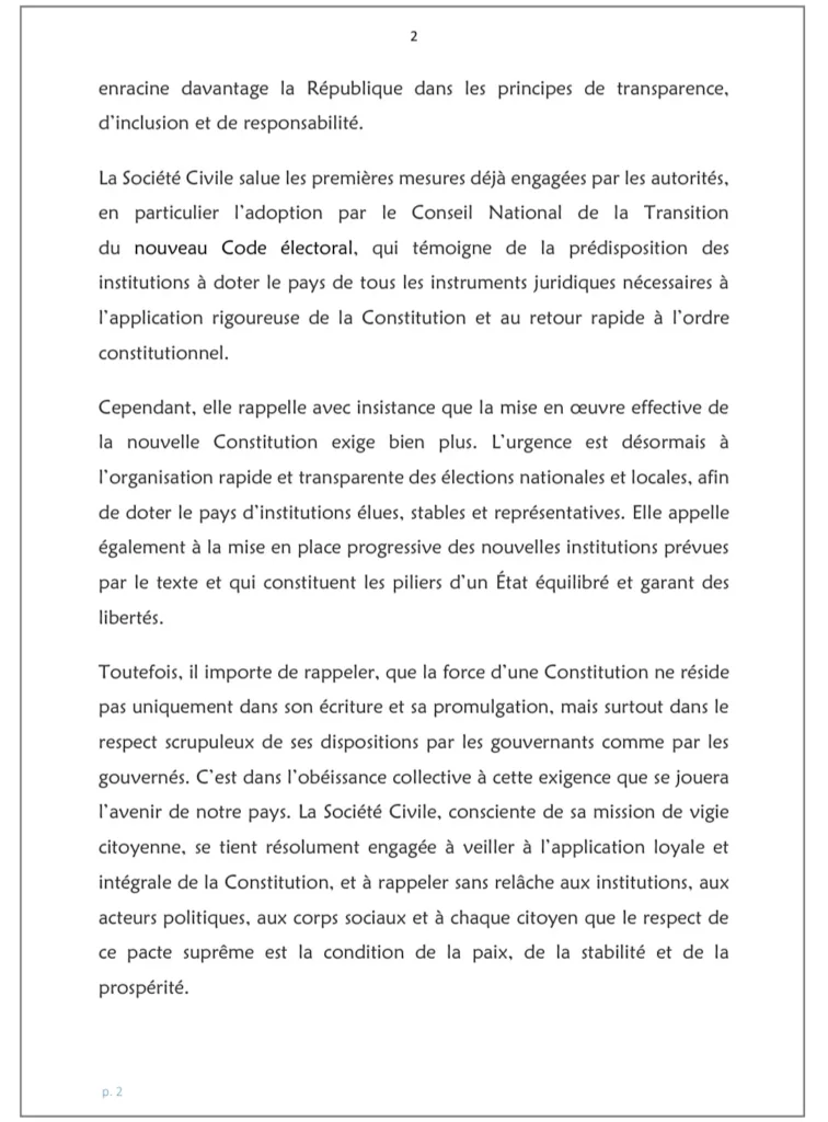 Promulgation de la nouvelle Constitution : la société civile ferme et engagée à veiller à son application loyale et intégrale (Déclaration)