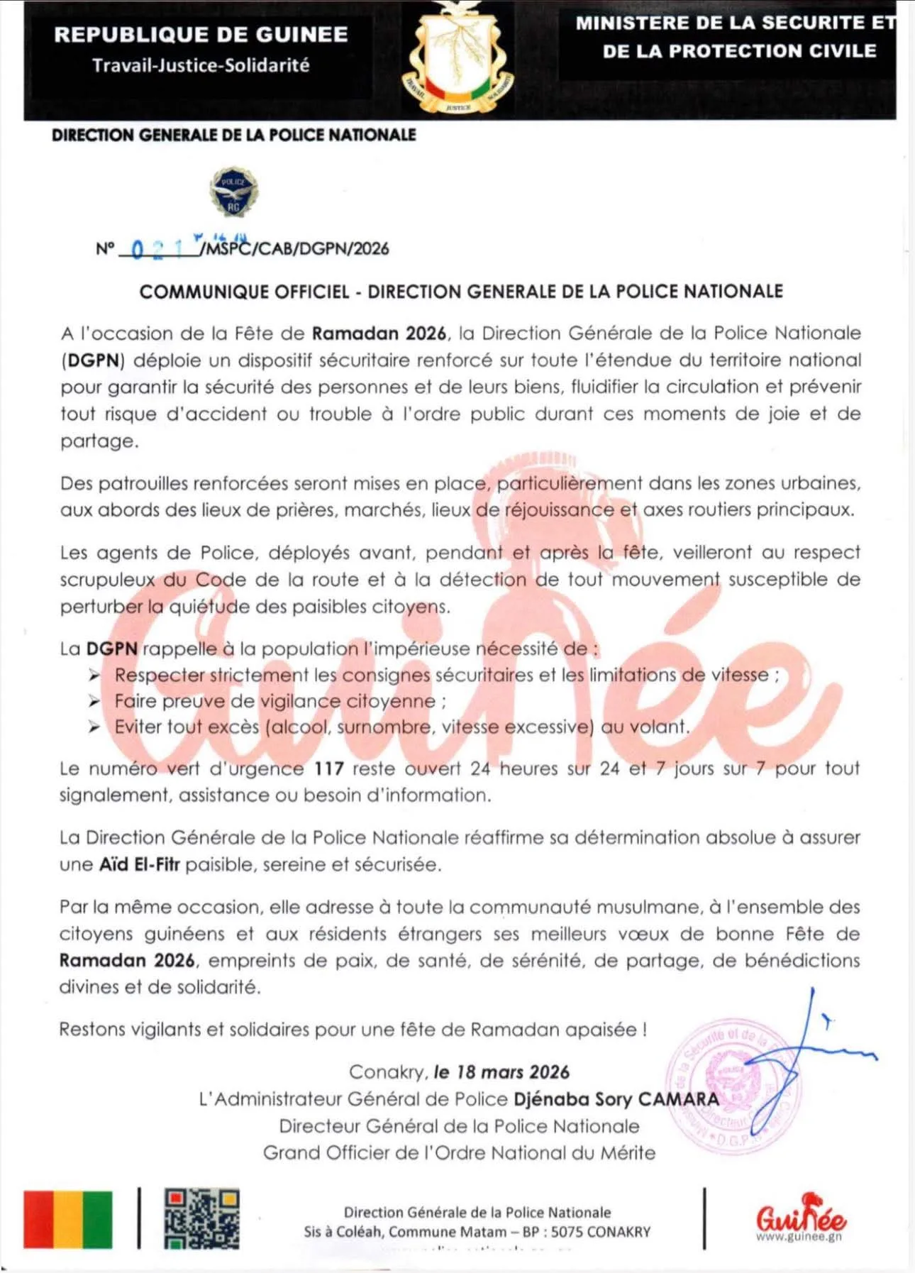 À l’approche des célébrations marquant le mois saint de Ramadan, la Direction Générale de la Police Nationale (DGPN) a annoncé, dans un communiqué rendu public ce mercredi 18 mars 2026, la mise en place d’un dispositif sécuritaire renforcé sur l’ensemble du territoire national.