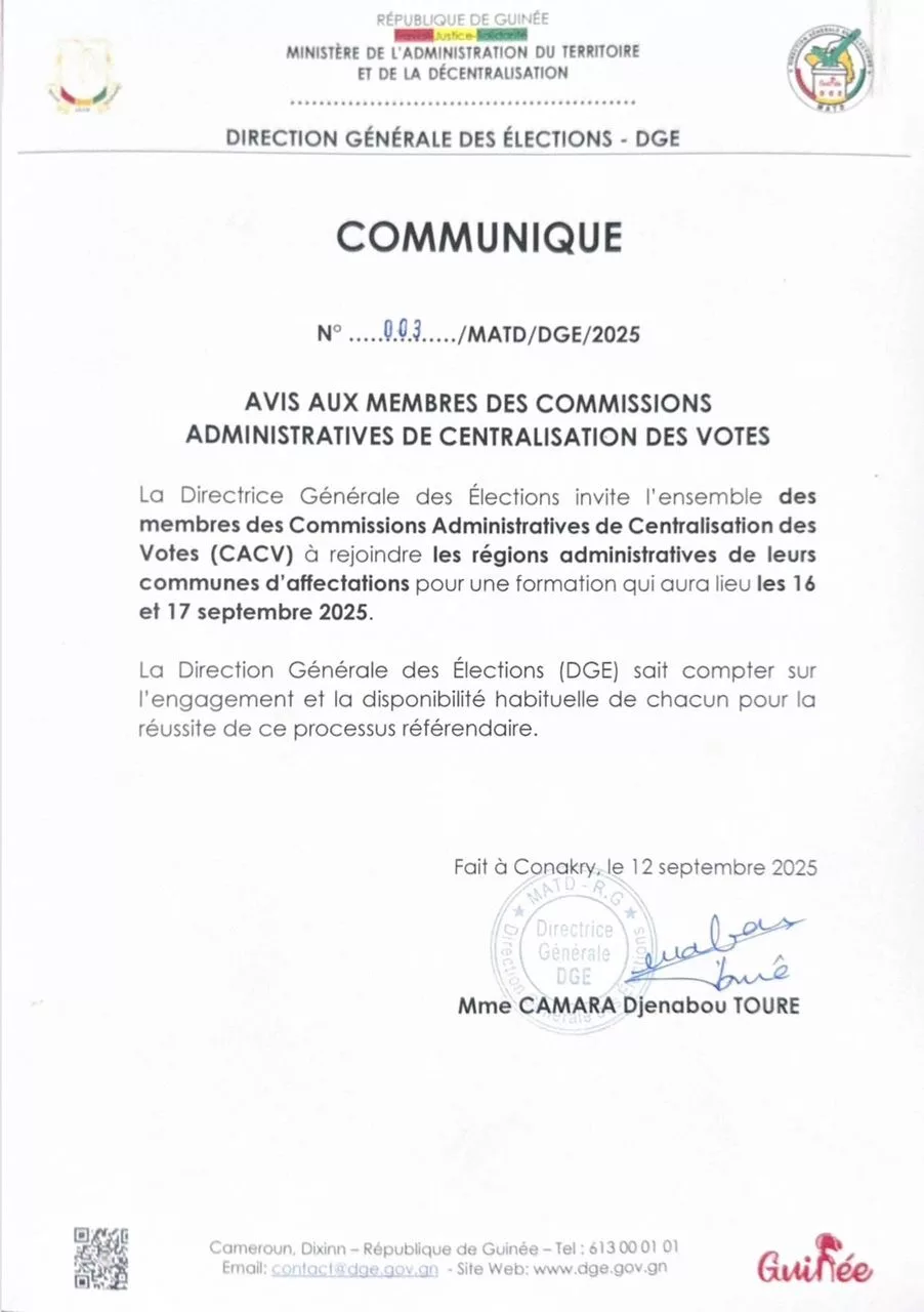 Dans le cadre de l’organisation du référendum du 21 septembre 2025, la Direction générale des élections (DGE) a, dans un communiqué dont détient copie votre quotidien en ligne rtgguinee.info demandé aux membres des Commissions des centres administratifs de centralisation des côtés (CACV) de rejoindre les régions administratives de leurs communes d’affectation.