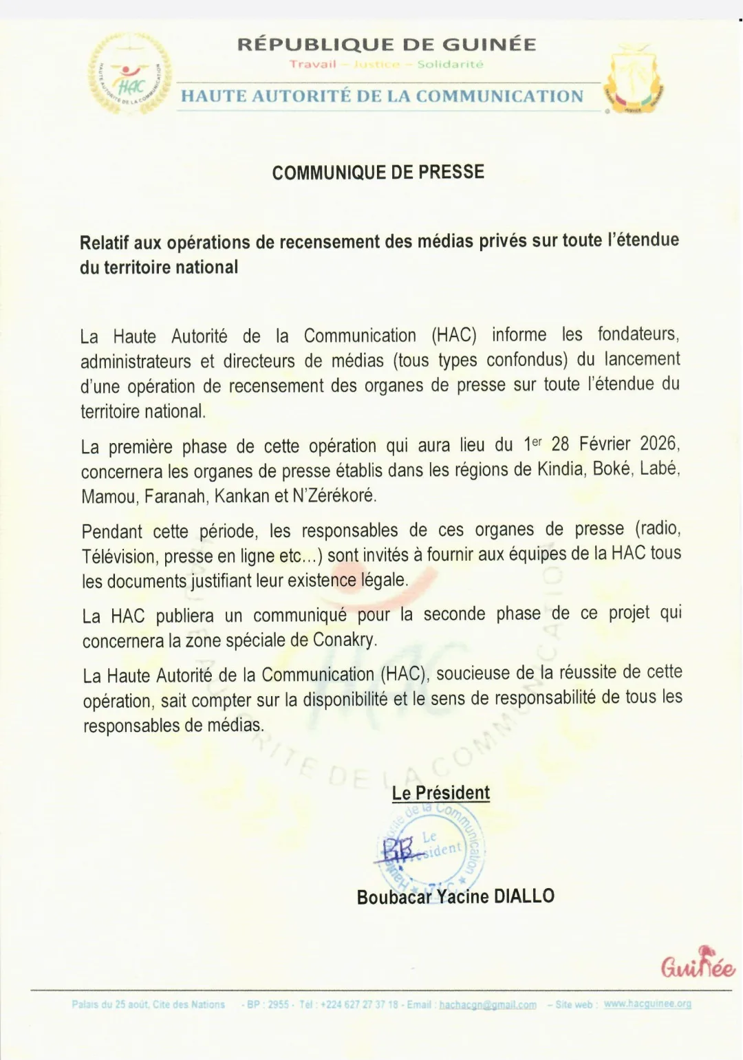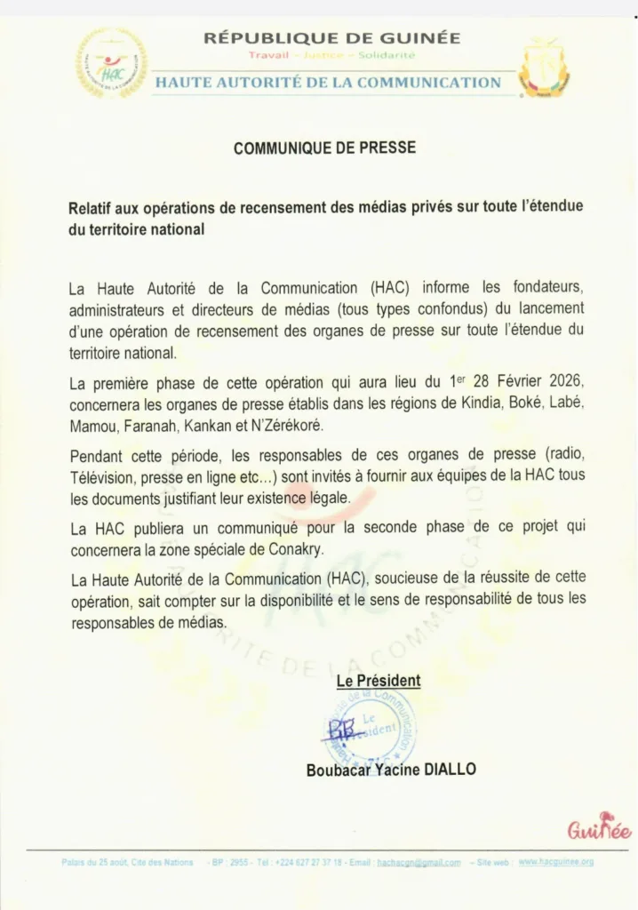 La Haute Autorité de la Communication (HAC) s’apprête à franchir une étape majeure dans l’assainissement et l’organisation du paysage médiatique guinéen. Dans un communiqué officiel dont copie est parvenue à notre rédaction dans la soirée de ce mercredi 28 janvier 2026, l’organe de régulation a annoncé le démarrage imminent des opérations de recensement des médias privés sur l’ensemble du territoire national.