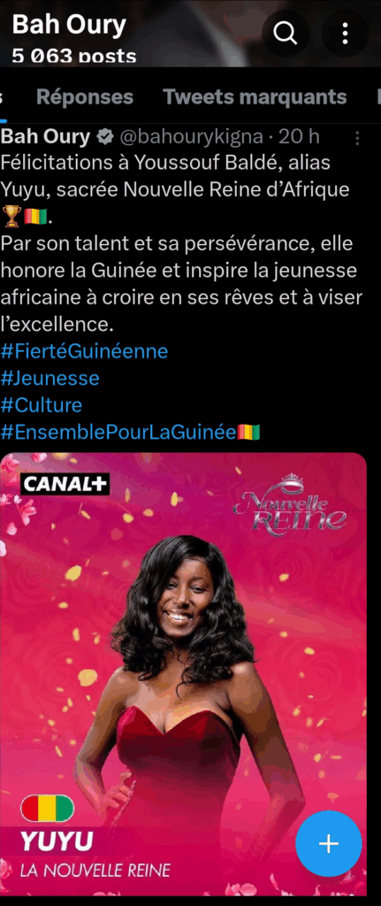 La guinéenne Youssouf Baldé, alias Yuyu a été sacrée Nouvelle Reine d’Afrique à travers la chaîne Canal+, ce samedi 09 août 2025. Dans une publication sur son compte X, le premier ministre chef du gouvernement Amadou Oury Bah a adressé ses félicitations à la nouvelle reine.