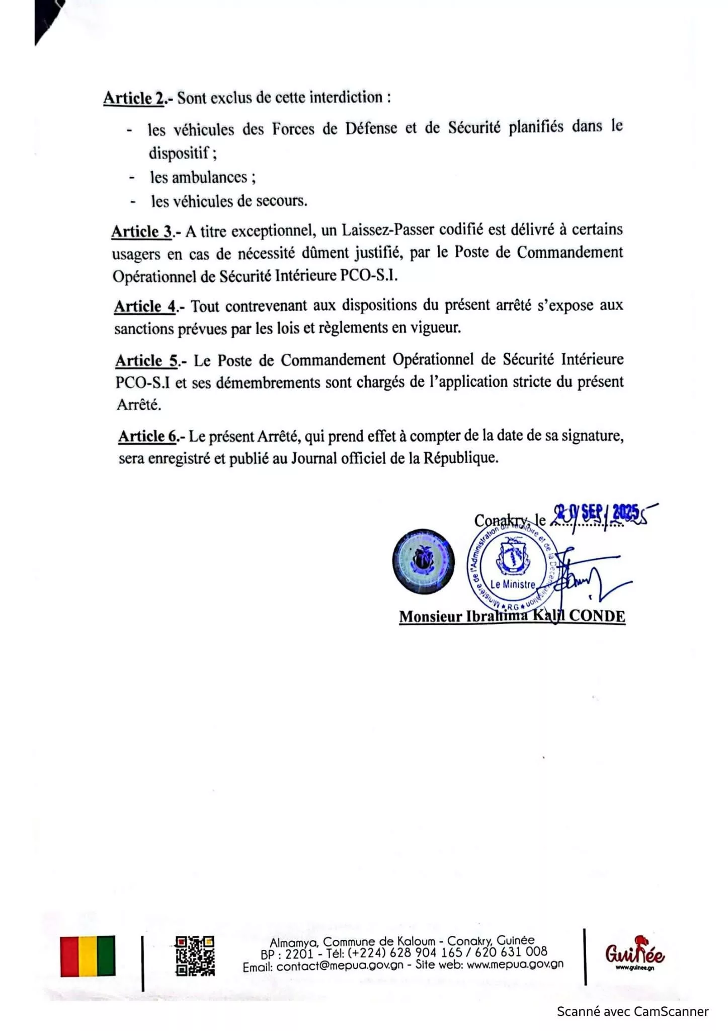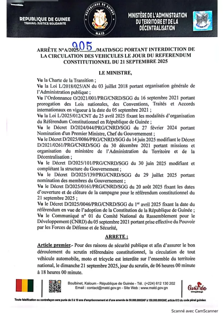 La circulation des véhicules automobiles, motos et tricycles est interdite de 6 heures à 18 heures. C’est du moins ce qu’a annoncé, dans un arrêté dont copie est parvenue à notre rédaction, le ministère de l’Administration du territoire et de la Décentralisation.