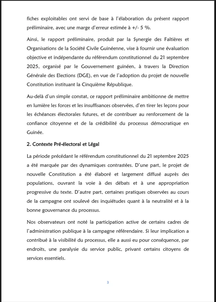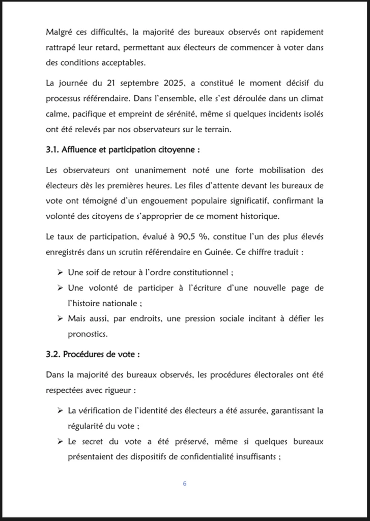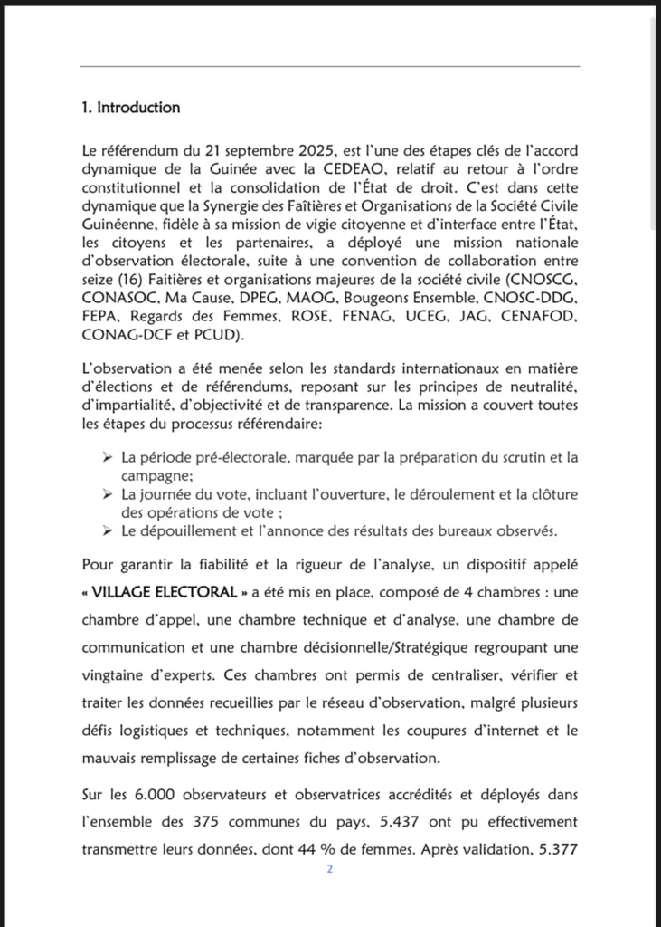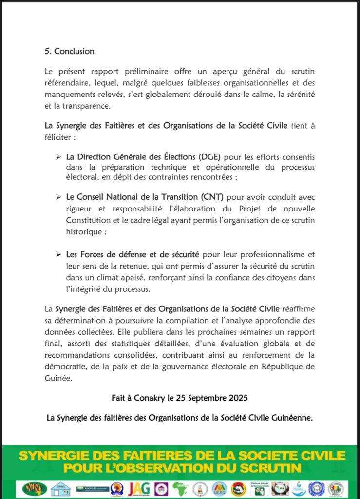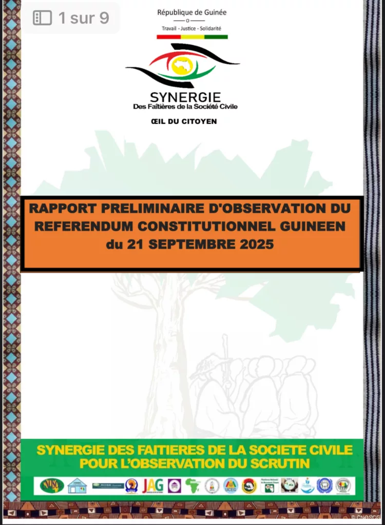 Après avoir observé le processus référendaire du 21 septembre dernier avec plus de 600 observateurs déployés sur l’ensemble du territoire national, la Synergie des faîtières des organisations de la société civile pour l’observation du scrutin référendaire a rendu public, ce vendredi 26 septembre 2025, son rapport final.