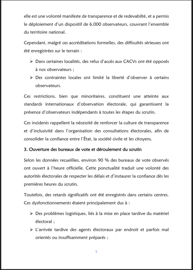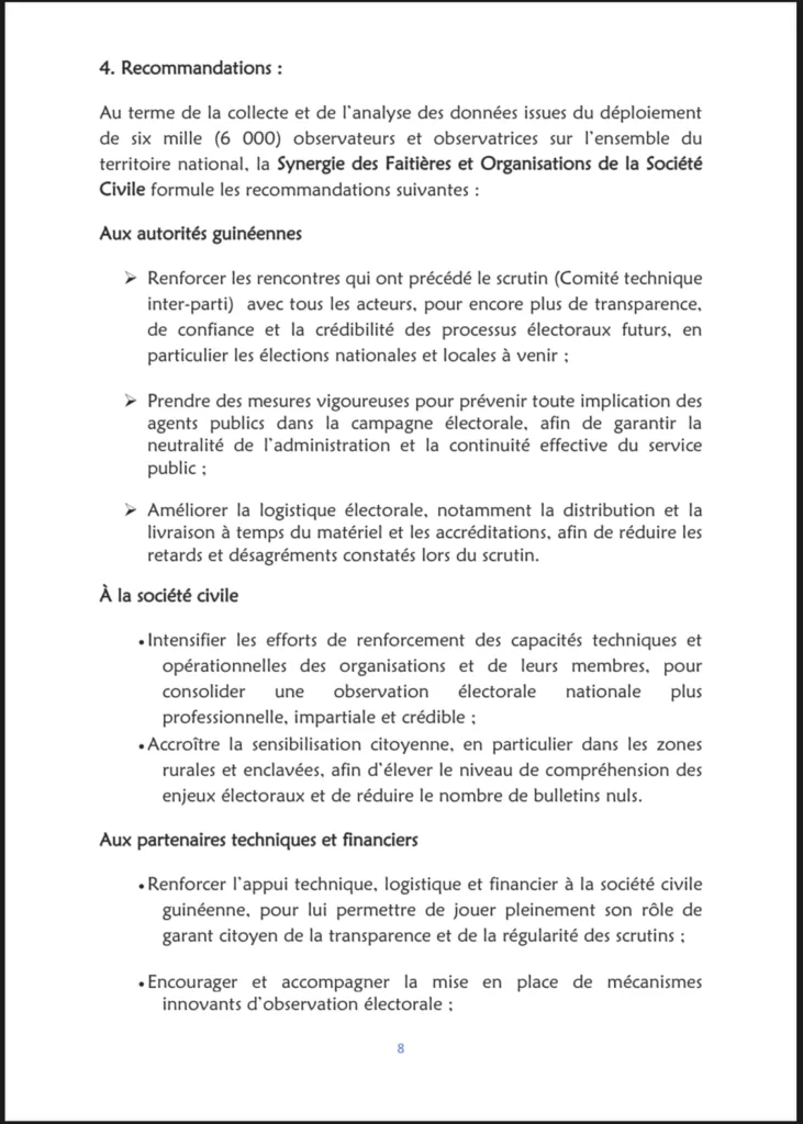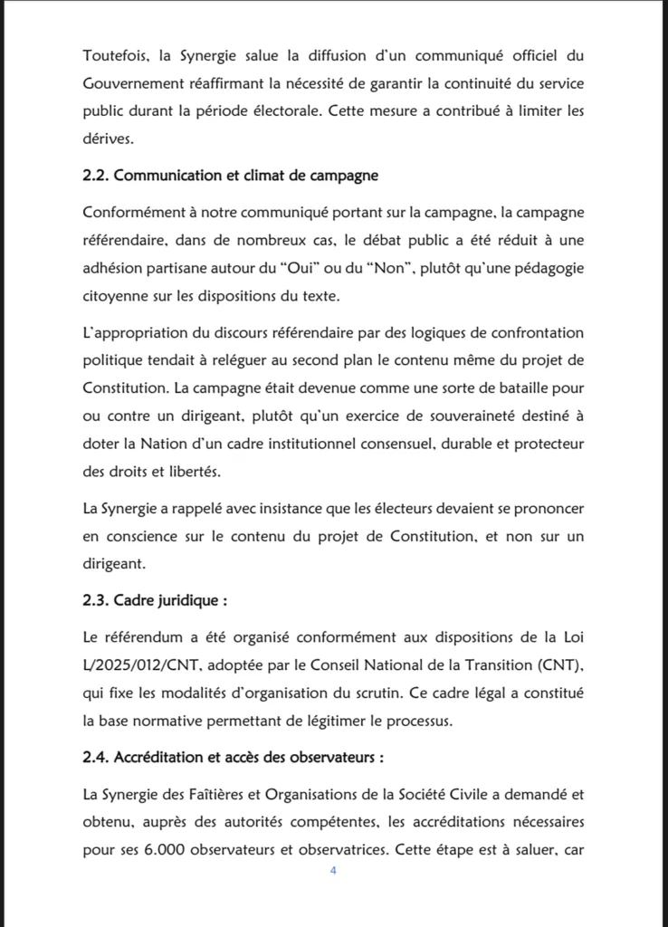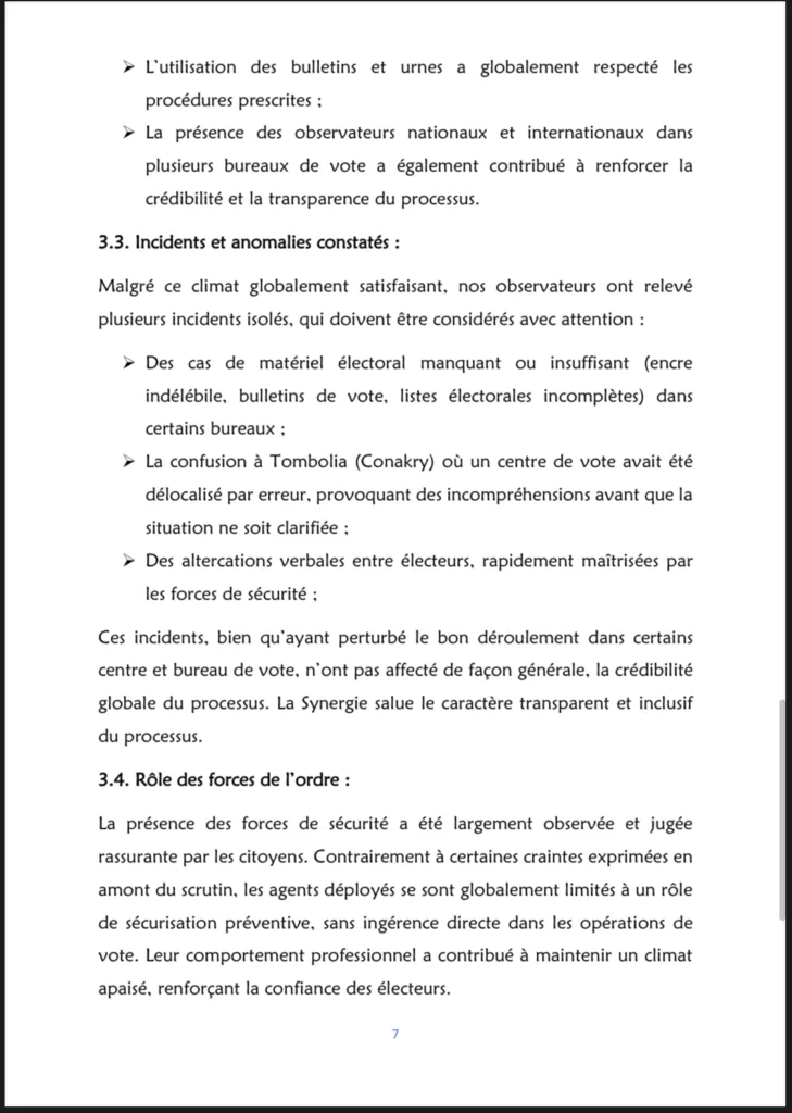 Dans ce document, la Synergie aborde plusieurs aspects du processus, notamment :le contexte préélectoral, la communication et le climat de campagne, le cadre juridique, l’accréditation et l’accès des observateurs, le déroulement du scrutin, ainsi que les incidents et anomalies constatés.