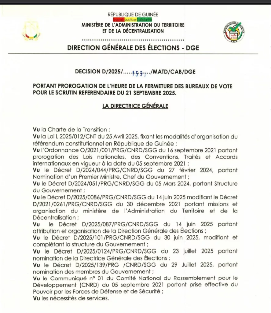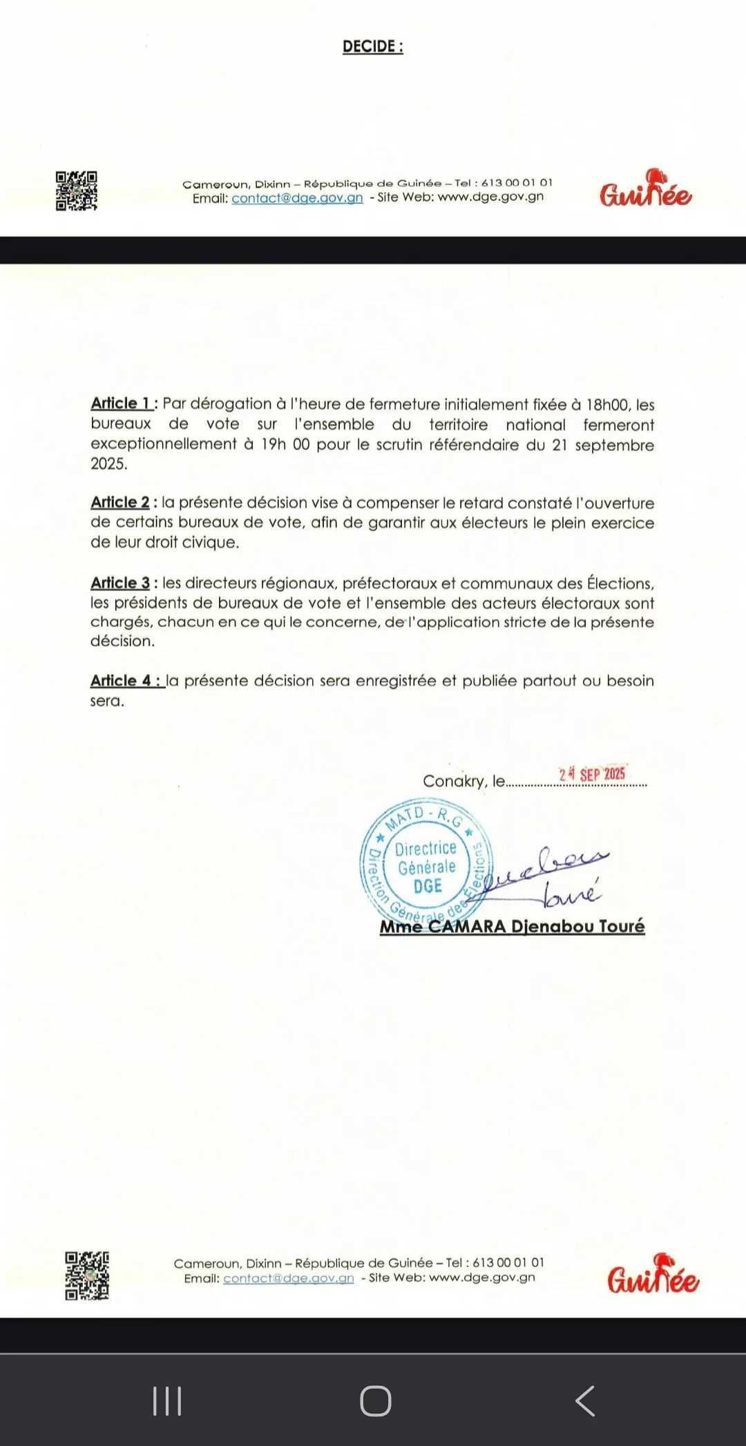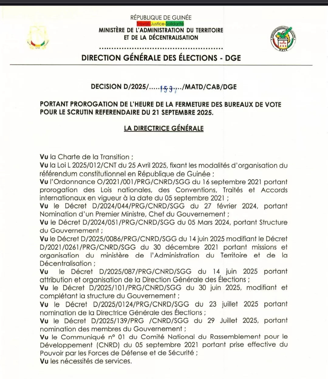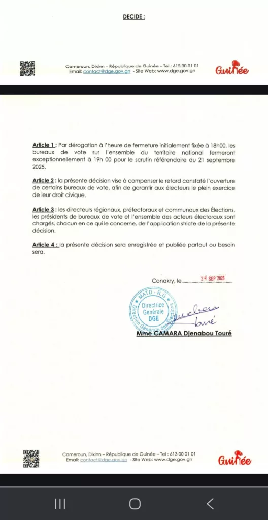 Initialement prévue à 18 heures, la fermeture des bureaux de vote a été reportée à 19 heures. C’est ce qu’a annoncé la Direction Générale des Élections (DGE) dans une décision parvenue à notre rédaction dans la soirée de ce dimanche 21 septembre 2025.