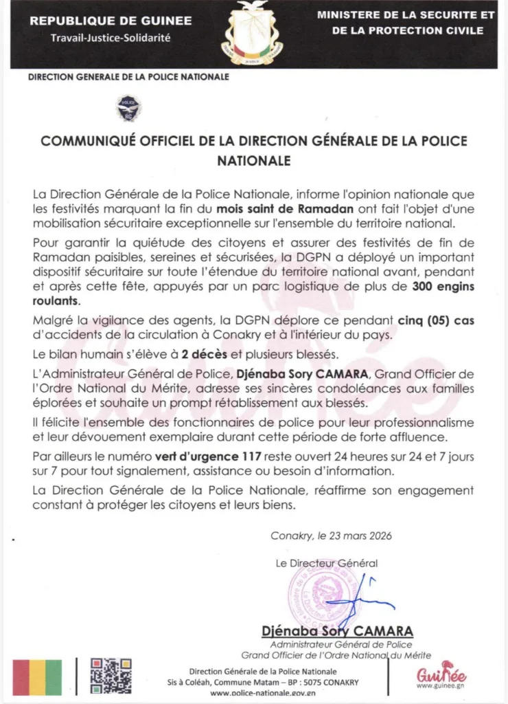 Dans un communiqué officiel publié ce lundi 23 mars 2026, la Direction générale de la Police nationale a dressé le bilan sécuritaire des festivités marquant la fin du mois de Ramadan sur l’ensemble du territoire national.