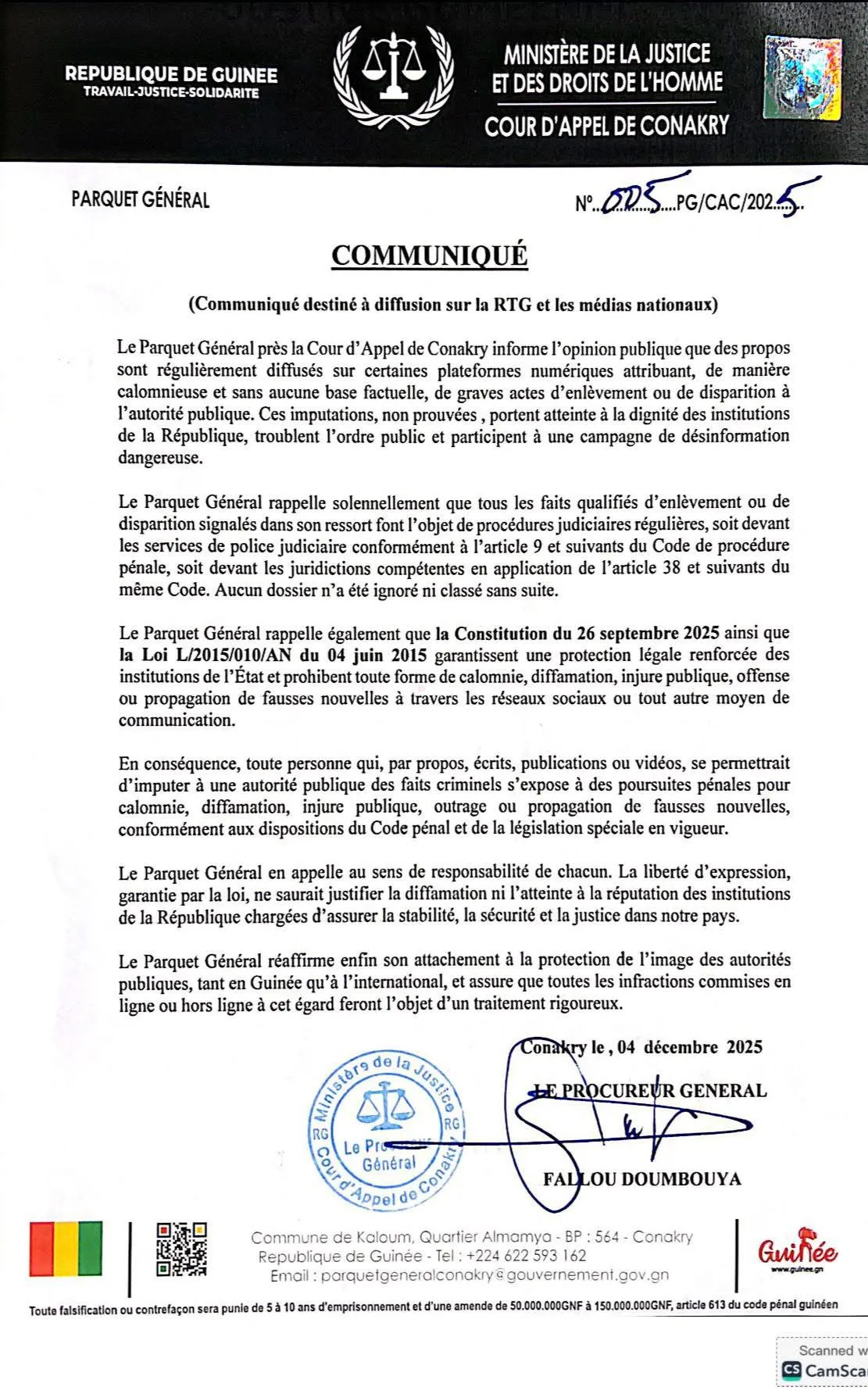Dans un communiqué dont votre quotidien en ligne rtgguinee.info détient copie, le parquet général près la Cour d’appel de Conakry, dirigé par le magistrat Fallou Doumbouya, met en garde contre les accusations de faits criminels portées contre les autorités publiques par certains citoyens.