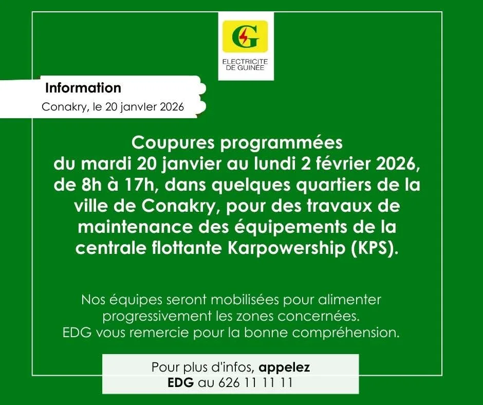 L’information a été rendue publique ce mardi 20 janvier 2025 par Électricité de Guinée (EDG), à travers un communiqué officiel dont rtgguinee.info détient copie.